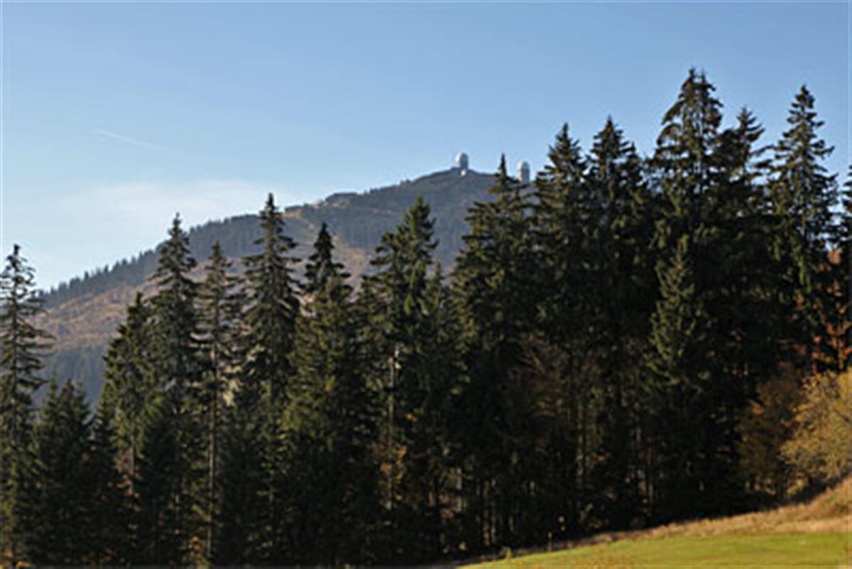 Z vrcholu lze za dobrého počasí spatřit rakouské Alpy. Pod svahy hory leží Velké a Malé javorské jezero.